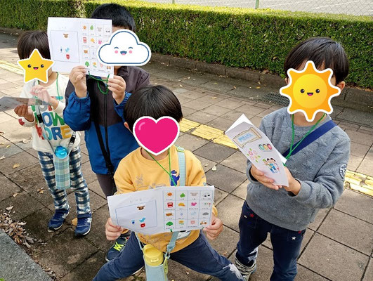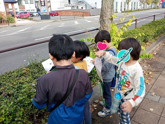 11月1日(土)は町探検へ行きました。あらかじめ決めたルートを通りながらカードに描かれた動物や物、植物を探し見つけたら同じシールを貼りました🔍出発する前にお約束として安全な場所に移動してからシールを貼ること、手を繋いで移動すること、全部見つけなれなかった際は家に帰ってお家の人と探すことなどお話をしました。事前に伝えることによって意識することができ、忘れてしまいそうな際に声を掛けると思い出し落ち着いて楽しく町探検を行うことが出来ました(^^♪また、ペアの子と職員を決めていく事によってペアを意識することが出来ました!